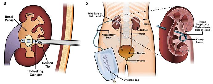 Nephrostomy tube and nephroureteral stent placement are minimally invasive procedures used to relieve obstruction in the urinary tract, usually caused by kidney stones, tumors, or strictures. A nephrostomy tube is inserted percutaneously into the renal pelvis to allow direct drainage of urine externally when the normal flow to the bladder is blocked. A nephroureteral stent is a catheter that traverses from the kidney, through the ureter, and into the bladder, allowing internal urine drainage. These procedures are typically performed under fluoroscopic or ultrasound guidance and can provide immediate relief from pain, infection, or renal dysfunction. They serve as temporary measures until definitive treatment, such as stone removal, tumor surgery, or ureteral repair, is possible.